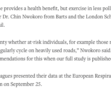 My research has had popular as well as scientific impact, with a piece on the health impacts of air pollution on commuters using active transport gaining particular international traction after press release at the European Respiratory Society Congress in Amsterdam in 2012.